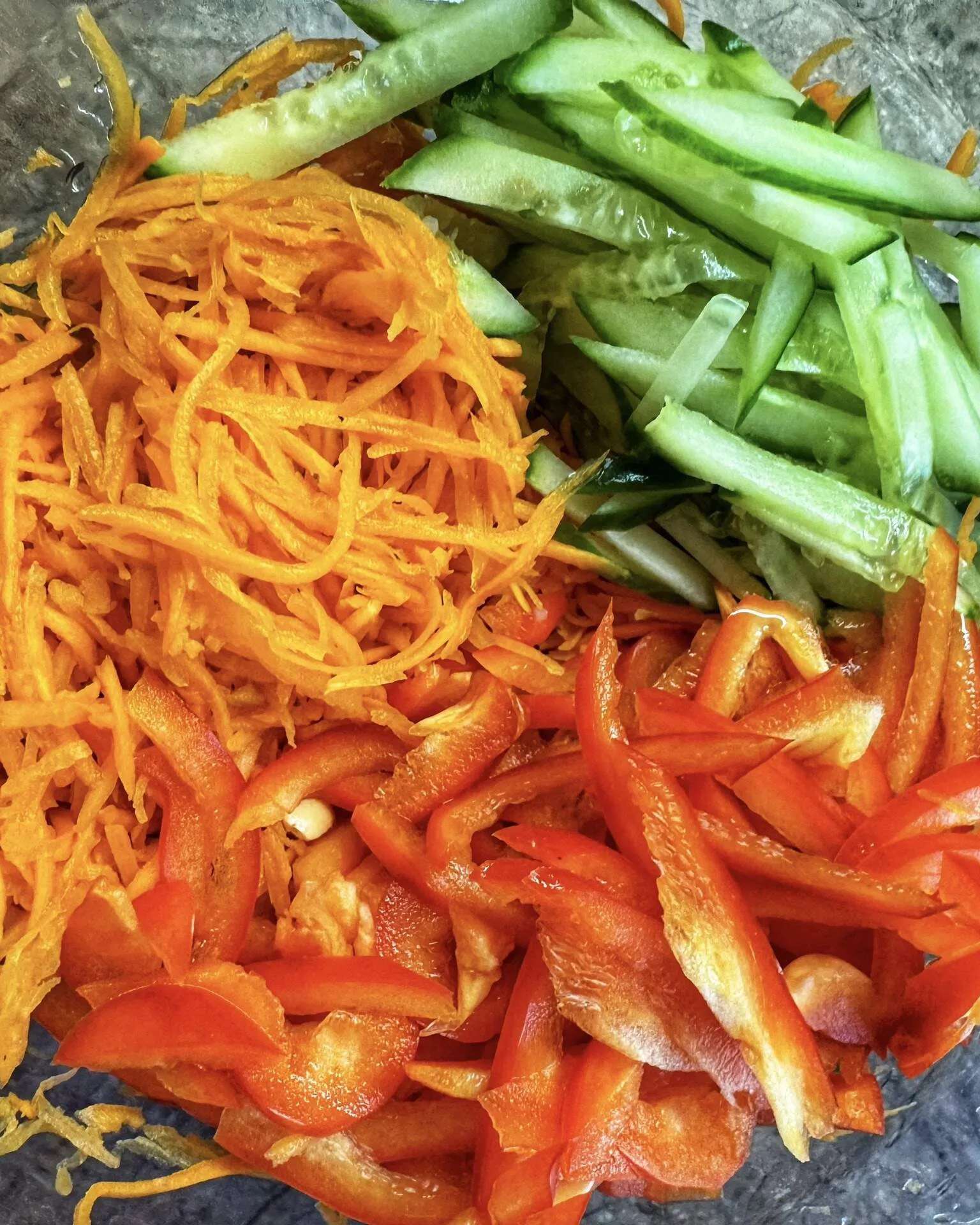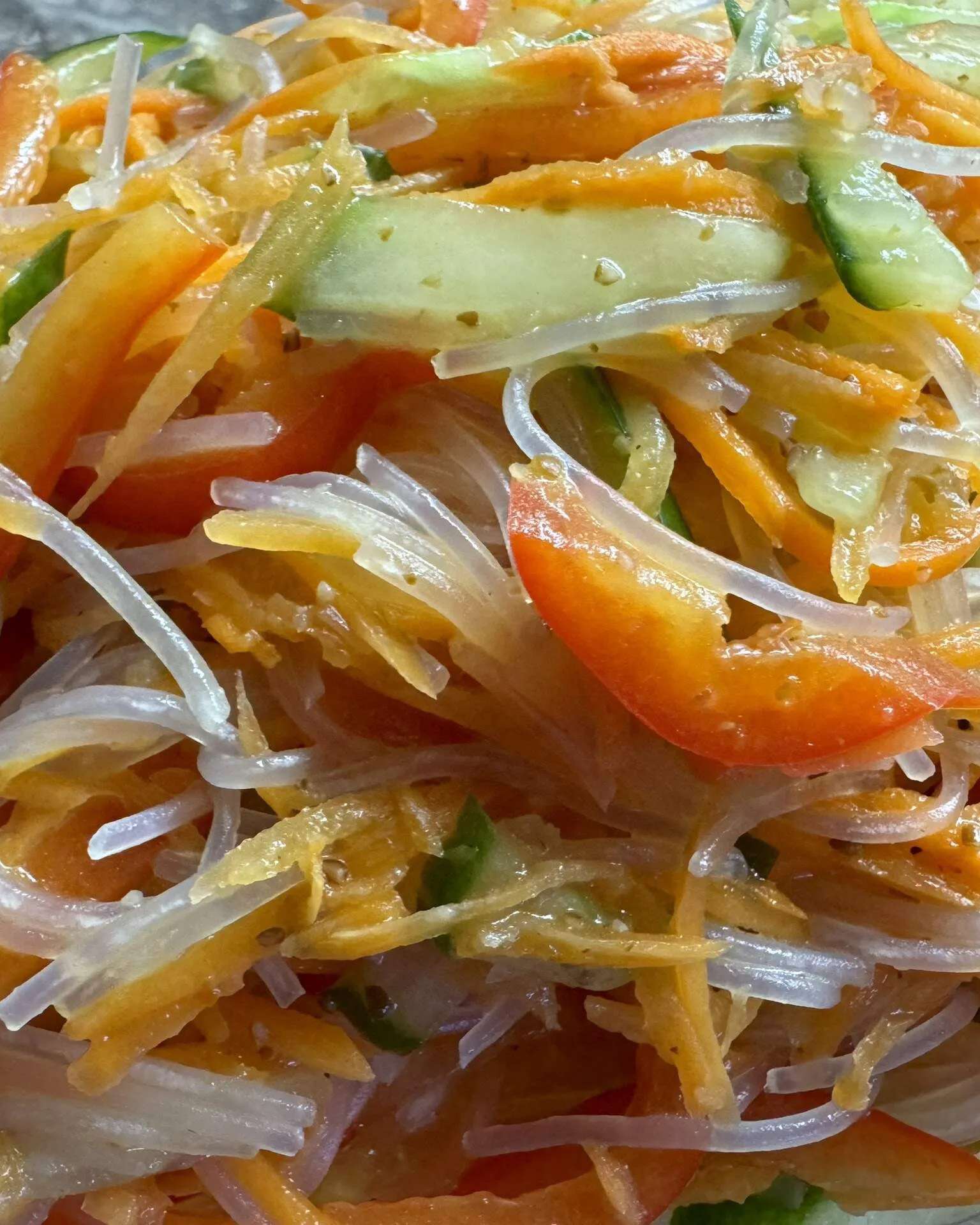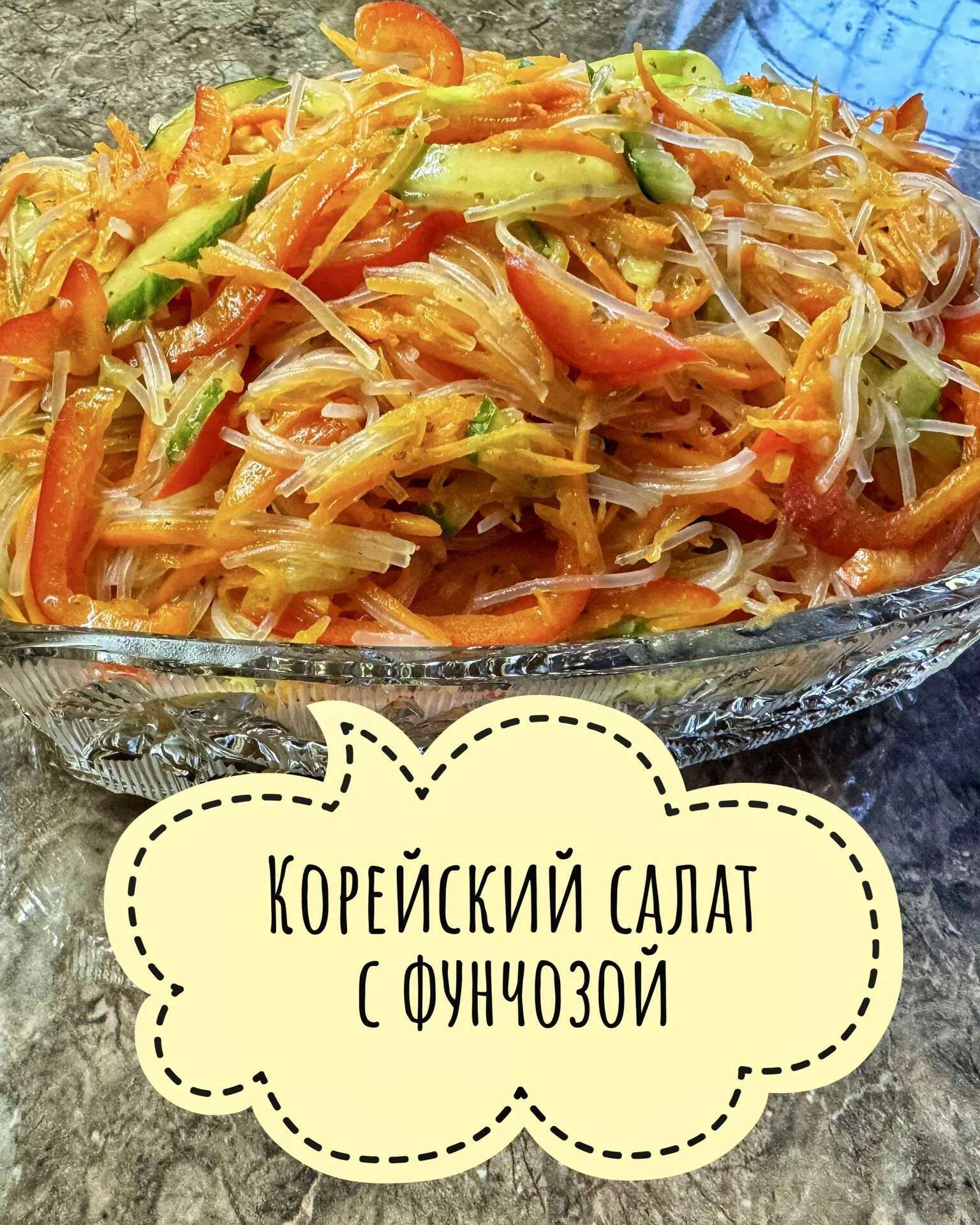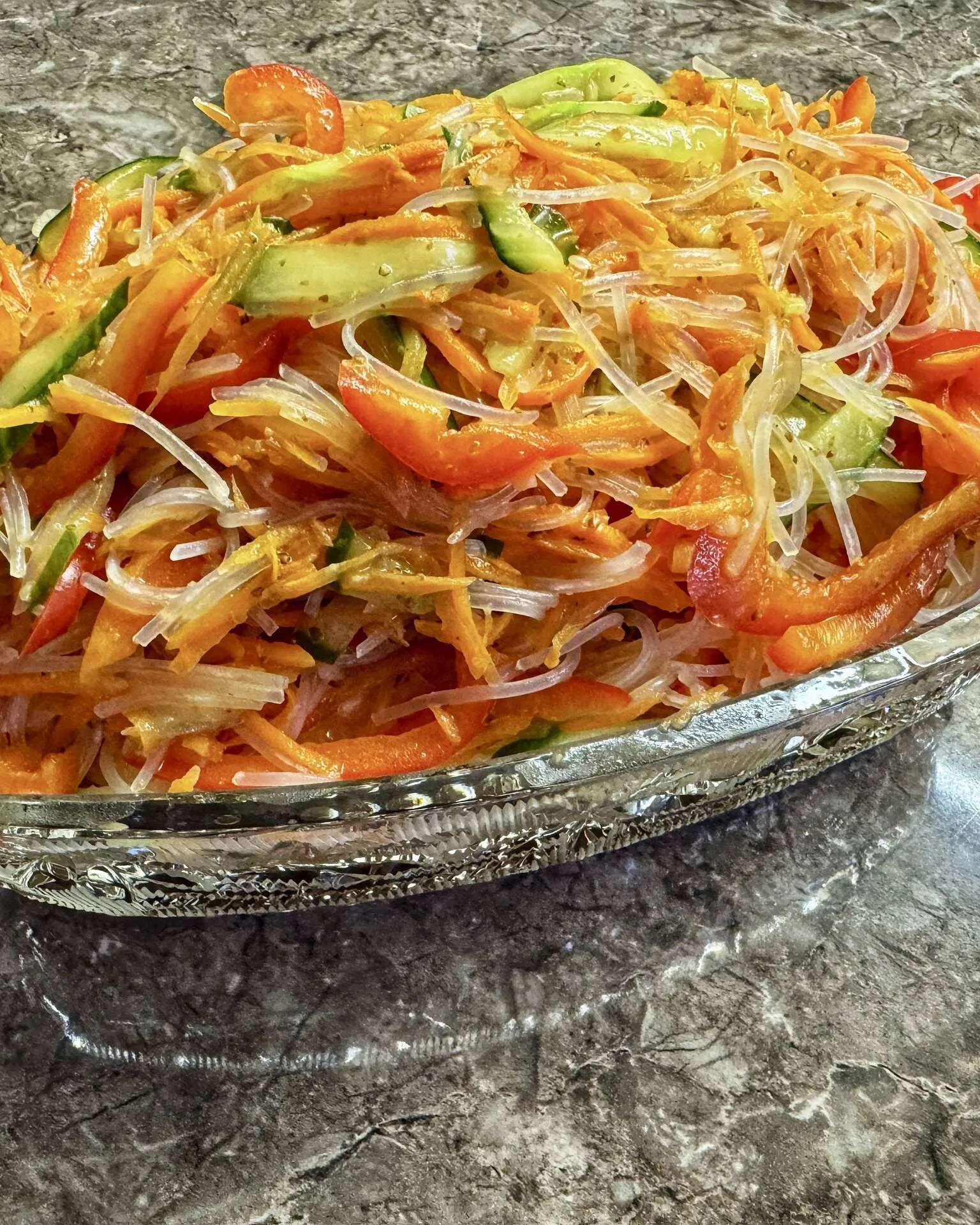 🍜Корейский салат с фунчозой, морковью, сладким перцем и огурцом, сдобренный пряной заправкой.
