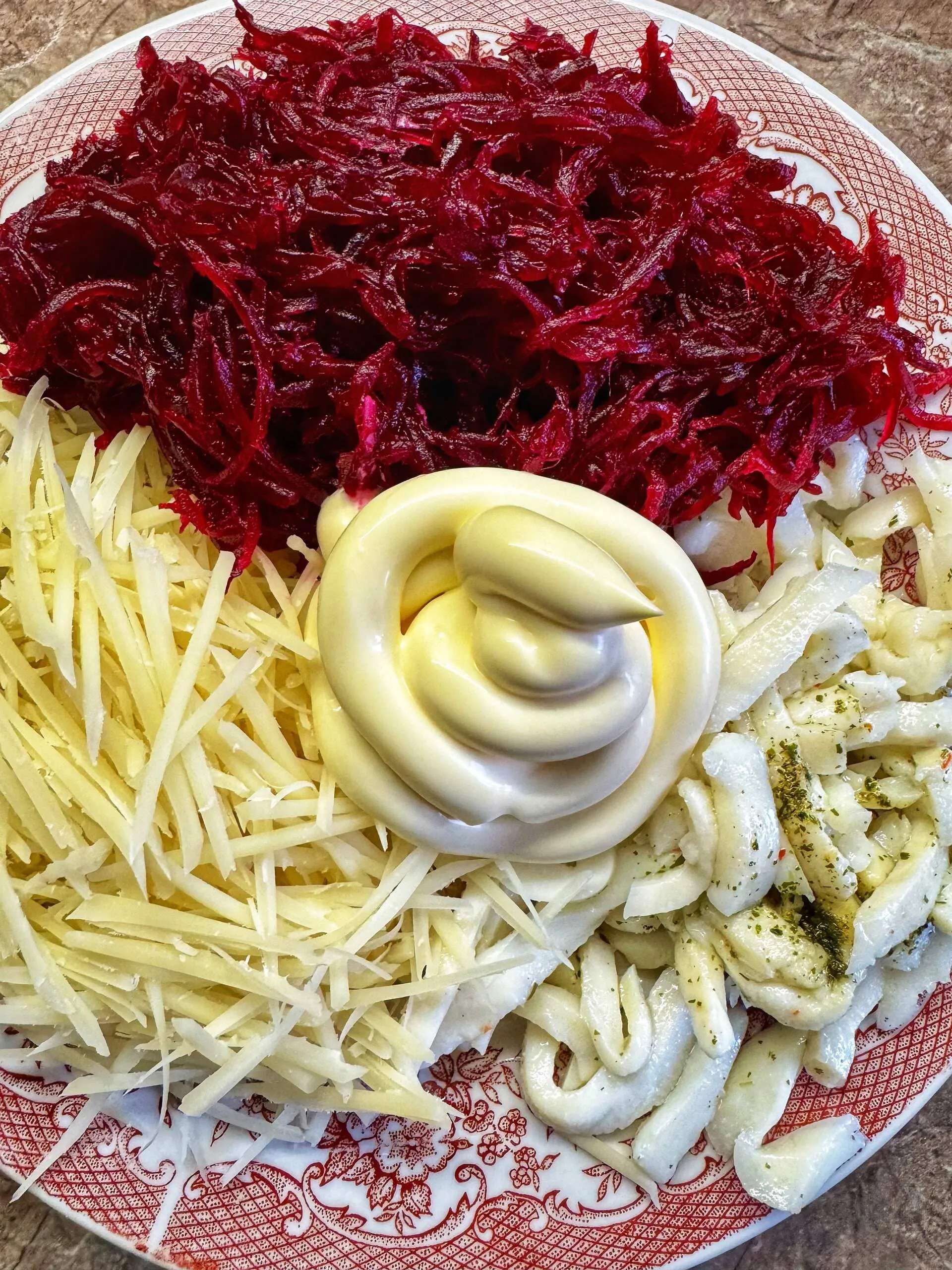 Смешать в миске кальмаров без масла, натёртый сыр, натертую свеклу, посолить салат по вкусу немного, добавить пропущенный через пресс чеснок и майонез+ сметану.